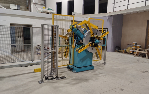 1000kg x 1000kg capacity Double Head Motorised Expanding Mandrel De-Coiling Machine to suit coils of 480mm to 620mm diameter, bore x 1400mm, outside diameter x 300mm maximum width. The mandrels are expanded by manual crank handle and driven by inverter controlled geared electric motors with contactless loop control to control the pay-off speed. A pneumatic snubber arm prevents ‘clock-springing’ of the un-banded coils. The two opposing mandrels rotate manually to stops on a vertical axis and allow processing of one coil whilst another coil is loaded.