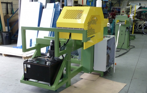 The following line of machinery is capable of producing a U shaped ring from coils of 28.14mm wide x 2mm thick stainless steel, at a rollforming rate of 25m/min less stoppage to cut time. The final production rate is therefore length dependent. Production of the retainers are with the coil bore and hence strip horizontal, producing the retainer in a downward curving direction. This will comfortably accommodate segments up to one metre in diameter and greatly simplifies product removal, as this is gravity assisted.